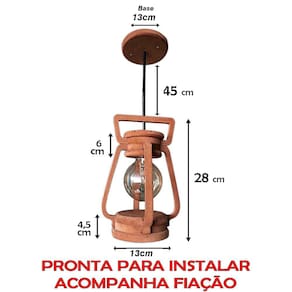 Bem vindo Crie inove e encante!A nossa linha de Moveis não para de crescer e agora traz para você, esta linda peça para organizar diversos ambientes da casa.Esta peça com certeza vai deixar a sua casa mais bonita!Luminária Lampião RUSTICO, fabricado em MDF e pintado a Mão. Envernizado deixando um acabamento envelhecido perfeito.Bom para iluminar e decorar ambientes como áreas de garagem, churrasco, garagens com bar, casa, chácara decorar festas, lanchonetes, casa de campo, pousadas.:::Especificações Técnica:::::: ACOMPANHA FIAÇÃO :::::: ACOMPANHA FIAÇÃO :::: CARACTERÍSTICAS:- Marca: Eco.Start E-commerce - Dimensões: - Diâmetro 13CM - Tamanho Lampião 28 cm - Peso do Produto 2 kg- Bocais 1- kit NÃO- Material: MDF (MEDIUM DENSITY FIBERBOARD)- MDF Ecologicamente Correto com Certificado FSC de alta qualidade- Cor: Mogno, Tabalo- Nível de Instalação: Fácil- Garantia de 90 dias Contra Defeitos de Fabricação:::CONTEÚDO DA EMBALAGEM:::- Ganchos SIM- Soquetes SIM- Base para Teto SIM- Fios SIM 45cm regulável - Lâmpadas NÃO :::ATENÇÃO:::OBS: Fazemos em tamanhos personalizados também. Consulte-nos!Todos os nossos produtos são feitos à mão e nos esforçamos para lhe entregar o mais rápido possível.:::SOBRE A COMPRA::::Envio:O prazo começa a contar após a aprovação da compra.Será enviado código de rastreio logo após a postagem do produto.:::ANTES DE COMPRARTire todas as suas dúvidas no campo perguntas e respostas do vendedor.* Os objetos decorativos não acompanham o produto*Fique à vontade para nos fazer perguntas.PERGUNTAS FREQUENTESOS PRODUTOS SÃO NOVOS?Sim! Todos os nossos produtos são novos.OS PRODUTOS TÊM GARANTIA?Sim, todos os nossos produtos têm garantia de fábrica. (3 meses)QUAL A VOLTAGEM?A voltagem depende da lâmpada 100/220 vACOMPANHA AS LAMPADAS?As lâmpadas não acompanha o produto Aguardamos sua um compra, é sempre prazer atendê-los Marca: Eco.Start e-commerce
