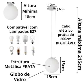 O corpo da luminária é metálico, assim como, a base de teto e a fiação elétrica, também no mesmo tom de cor. Composta por um globo de vidro branco leitoso fosco de 15cm, transmite leveza e organicidade. Acompanha fiação elétrica de 2 metros já instalada no soquete E27. A altura do cabo elétrico pode ser regulado no momento da instalação, tornando-se versátil para diversos espaços, possibilitando ser montado com alturas entre 18cm e 215cm. Ainda, inclui um kit fixação com travessa, parafusos, buchas e arruelas, para maior comodidade e praticidade. Tudo isto, proporciona uma atmosfera orgânica e única à luminária.