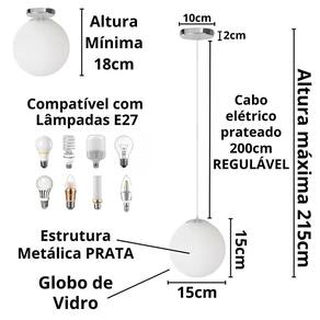Luminária Lustre Pendente 215cm Jabuticaba Globo Vidro 15cm Metal Teto Gimpo PJ15