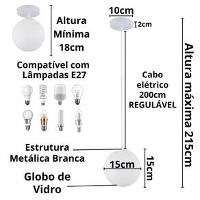 Luminária Lustre Pendente 215cm Jabuticaba Globo Vidro 15cm Teto Gimpo PJ15 + Lâmpada 12W