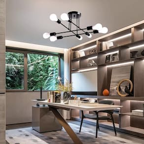 Todo corpo da luminária é metálico, assim como, a base de teto, também no mesmo tom de cor, o que proporciona robustez e resistência. Possui capacidade para 8 lâmpadas, cada uma até 60 Watts, o que permite ampla capacidade de luminosidade. Suas hastes são ajustáveis, direcionáveis, e confere, assim, organicidade, além de uma ampla gama de possibilidades de configurações de montagem.