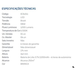 Marca: EmpaluxPotência: 8WLúmens: 1200Temperatura de cor: Branco frioQuantidade de LEDs: 40Tensão: BivoltNúmero de faróis: 2