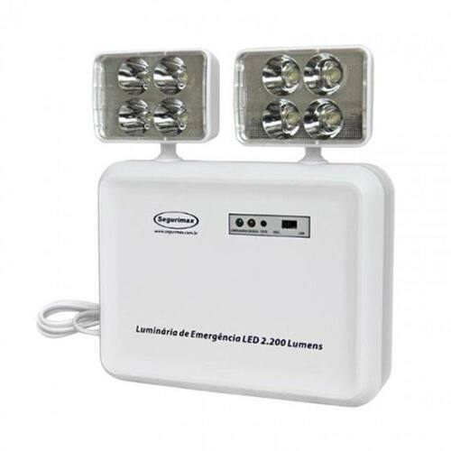 Constituída por 02 faróis, 8 leds de alta potência, lente com ângulo de 60, Atende os requisitos exigidos pelas normas nacionais (NBR 10898). Este equipamento foi desenvolvido para iluminação de emergência (aclaramento) em galpões, hotéis, residências, escritórios, indústrias, supermercados. Para uma área de até 450 metros quadrados CARACTERÍSTICAS TÉCNICAS Modelo Luminária de Emergência LED 2200 Lumens - 2 Faróis Marca Segurimax Tipo de Bateria Gel Selada Dimensões 195 x 227 x 5,4mm Tensão Bivolt Consumo Não Fluxo Luminoso 2200 lumens Autonomia 3 horas Área de Abrangência Uma área livre de até 450 metros quadrados Índice de Proteção IP20 Garantia 2 Anos