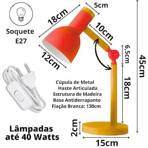 Luminária Mesa Abajur 45cm Articulada Retrô Madeira Gimpo KJTD-685-PAI Cor: Vermelho Luminária de Mesa 45cm Retrô Articulada KJTD-685 Gimpo Haste articulável. Estrutura em Madeira. Bivolt. A Luminária Articulada KJTD-685 da Gimpo é uma peça que ilumina com suavidade e elegância. Une estilo e praticidade em um só produto. Perfeita para mesas de estudo, bancadas, escritórios, quartos, cabeceiras, escrivaninhas, salas ou até para destacar ambientes Transporte-se para os anos 50 com um item de decoração retrô. Desenho inspirado na época dourada do design, uma vez que adiciona um toque de estilo vintage. Além de iluminar, é um elemento decorativo que certamente atrairá atenção. A estrutura em madeira, traz um toque natural, robusto e sofisticado. Sua articulação permite ajuste de ângulo para melhor direcionar a luz. A base possui peso e tecnologia antiderrapante, o que torna a luminária perfeita para articulações e projeções de luz. Com linhas elegantes, se adapta a qualquer tipo de decoração, seja moderna ou clássica. Pode ser utilizada com lâmpadas comuns, compactas econômicas, incandescentes, fluorescentes, coloridas, LED's, contanto que até até 40 Watts, soquete E27. Suporta lâmpadas 110v ou 220v bivolt . Caso usar lâmpada 110v, ligar em tomada 110v. Se utilizar lâmpadas 220v, conectar em tomada 220v. Caso a lâmpada seja bivolt, funcionará em ambas voltagens. Seja para trabalhar em um projeto, ler ou simplesmente iluminar um espaço escuro, é a escolha perfeita Super estilosa, decorativa e funcional. Experimente uma nova maneira de iluminar seu espaços. Itens inclusos: 1 luminária KJTD-685 Gimpo. 1 Base de madeira com antiderrapante. 1 Cúpula em metal. 1 Cabo de energia com 1,3m de comprimento a partir da base. 1 liga / desliga no cabo de energia a 40cm da base . 1 Plugue de tomada 2 pinos padrão brasileiro . Obs. 1: Não acompanha lâmpada. Obs. 2: Luminárias pretas a fiação é preta. Em todas demais cores a fiação é branca. Dados técnicos: Altura máxima: 45cm. Diâmetro da Cúpula: 12cm. Comprimento da Cúpula: 18cm. Diâmetro da Base: 15cm. Altura da base: 2cm. Comprimento total da haste: 35cm. Comprimento do cabo de energia: 130cm. Distância do encaixe soquete até a extremidade da cúpula: 12cm. Soquete: E-27. Material: Metal e madeira. Potência: lâmpadas até 40 Watts. Voltagem: Bivolt. Suporta lâmpadas 110v e 220v. Peso aproximado: 0,9kg. Medidas da caixa: 19 X 19 X 28cm. : 3 Meses. Faça seu pedido com conforto, segurança e rapidez Lembrando que mudanças não são permitidas após fechamento do pedido. Atente-se então, para comprar a luminária conforme modelo desejado.