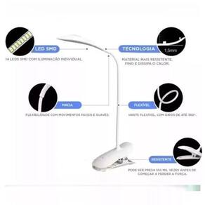 Luminaria De Mesa Led Touch Aticulável Flexível Lamp Usb GARRA Característica: 1. Brilho ajustável: 3 níveis de brilho da luz que você pode ajustar de acordo com sua preferência, com pouca luz, luz média, destaque. 2. Recarregável USB: A lâmpada de leitura pode ser alimentada por carregador USB, notebook USB, adaptador de celular etc. 3. Pescoço flexível de 360: A mangueira universal pode ser ajustada arbitrariamente para atender aos requisitos de ângulo luminoso de 360. 4. Presilha forte: o clipe é muito forte e apertado e irá prender nas menores bordas e ficar posto, e também se prende a qualquer coisa perto de você. 5. Aplicação ampla: A lâmpada do livro é perfeita para trabalhar, ler, estudar, jogar computador, ponto cruzado, etc. Especificação: Tipo de item: Luz de leitura LED Material: ABS Tamanho: Comprimento da base aprox. 12,5 cm/4,92 pol. , largura aprox. 6,5 cm/2,56 pol. Peso: Appeox. 223g/7,87oz Bateria integrada: Bateria de lítio 1200mAh incluída Fonte de luz: Luz branca Método de carregamento: USB Engrenagem: Baixo brilho - médio brilhante - destaque 3 níveis Modo de : Controle de toque Vida útil: 20000H Marca: Não Informado Ean: 7843887802281
