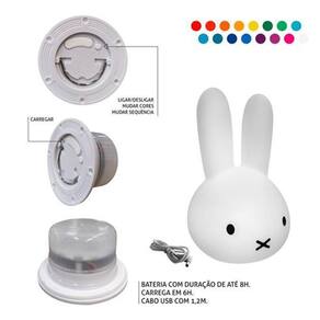 Perfeita para sua decoração a Luminária Mini Cabeça Coelho RGB com Fio Big Miffy, vai encantar os quartos infantis, além de enfeitar pode agregar no espaço de leitura por ser uma luz difusa, o que não agride a visão, além de deixar o local com uma iluminação mais baixa. Sendo Bivolt com a Luminária Mini Cabeça Coelho RGB com Fio Big Miffy, você não precisa se preocupar com nada, basta ligar na tomada e ligar. Acompanha um incrível sistema de Led RGB, a prova d`água e cabo USB, que pode ser ligado a sua tomada de celular ou a qualquer produto com entrada USB, como computador, televisão. O acionamento é manual, no próprio sistema, bastando apertar o botão para ligar/desligar, mudar a cor da iluminação e produzir efeitos de Flash, Strobe, Fade e Smooth.Especificações do produto:Material: Polietileno Dimensões:  36 x 24 x 22 cm  Tensão: 110V/220V (verificar tensão da lampâda utilizada) Cabo de força: Com interruptor medindo 1,8m de comprimento Cuidados: Limpar com pano úmido e macio Informações adicionais: Evitar quedas e impactos bruscos. Limpar com pano úmido e macio. Não utilizar produtos químicos e abrasivos. Contém: 1 Luminária Mini Cabeça Coelho RGB com Fio Big Miffy, 1 controle remoto e 1 lâmpadas LED RGB com 16 cores