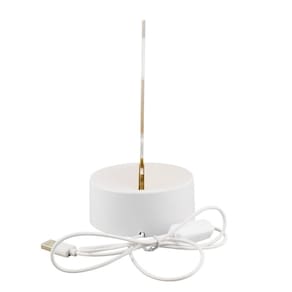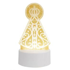 Luminária com base branca e redonda e com led que projeta a luz branca em uma placa acrílica transparente gravada a imagem de Nossa Senhora Aparecida. A placa é totalmente transparente para ficar visível a imagem gravada na placa foi usada um papel ao fundo da placa para gerar contraste nas fotos. Produto bivolt alimentado com cabo USB e interruptor liga/desliga no cabo.