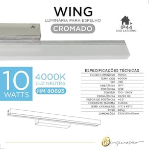 Com a Arandela Wing, a iluminação perfeita para seu espelho ou quadro está garantida Com LED integrado de 4000K, 10W e luz leitosa, seu ambiente ficará mais elegante e sofisticado. Além disso, seu acabamento cromado em alumínio e difusor em acrílico garantem qualidade e durabilidade. E o melhor de tudo: com grau de proteção IP44, pode ser utilizada em áreas úmidas sem preocupaçãoFluxo Luminoso: 700lmAbertura: 160Temperatura de Cor: 4000K - Branco NeutroCor: CromadoComposição: Alumínio e AcrílicoIRC: 80Potência: 10WTensão: 110 - 230W Bivolt Frequência: 50/60 HzFator de Potência: 0.5Corrente Máx: 0.260ATemp. Operação: 0C à 65CPeso: 465gDimensões: 520x150x80mm