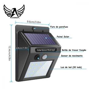 Luminária De Parede Energia Solar Com Sensor De Movimento Presença 30 Leds Bateria Lâmpada Luz À Prova D' Água Luminária De Parede Energia Solar Com Sensor De Movimento Presença 30 Leds Bateria Lâmpada Luz À Prova D' Água - Luminária- Movido a energia solar- Sensor de movimento Especificações técnica:- Painel Solar: 0,55 W. 17% de eficiência- Bateria de íons de lítio: 3,7 V 1200mAH- Potência do LED: 0,2W/PC- Sensor Noturno: - Ângulo de movimento e distância: 120º, 5m- Tempo de atraso: 15s/30s- Interruptor: OFF/AUTO- Modo de iluminação: Desligado/Destaque- Tamanho: 102x53x130mm Contém:1 Luminária Solar