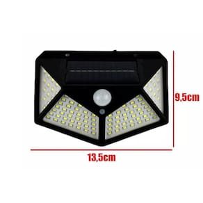 Luminária Parede Solar 100 leds Sensor de Presença Arandela Luminária Parede Solar 100 leds com Sensor de Presença Benefícios: - Ajuste frontal é mais fácil de operar; - Economia de energia e proteção ambiental; - Durabilidade e instalação simples só precisa de 2 parafusos inclusos ; - É fácil de usar e controle inteligente de detecção de luz; - Deixa sua casa mais bonita e inteligente Funcionamento: - Totalmente apagada no escuro e acende 100% do brilho quando detecta movimento e fica ligado por 18 segundos e depois apaga; - Sempre acesa com 40% do brilho e quando detecta movimento acende 100% do brilho por 18 segundos e depois volta nos 40% de energia; - Assim que escurece, a luminária acende 40% do brilho o tempo todo até amanhecer. E não funciona detector de movimento. Especificações: Potência de iluminação: 20 Watts em LED, equivalente a 150 Watts incandescente.Bateria: 3.Painel Solar: 5.5V 1wproteção em Nível: IP65Distância de detecção: 3-5mMedidas: 13,5cm x 9,6cm x 5,5cmSensor de movimento ângulo: 120ºCor dos LEDs: Branco-frioAcompanha: 1 Luminária Solar de 100 Leds 2 Parafusos 2 Buchas 1 Manual Marca: Quick Store Ean: 789653234429