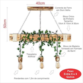 - Fabricada em Madeira Maciça Legalizada e Sustentável; - Acabamento estilo Safari e detalhes em Corda de Sisal; - Altura ajustável, conforme arranjo dos Pendentes; - Acompanha 3 Pendentes com 1,5 Metro cada, a serem dispostos conforme sua preferência; - Acompanha 4 metros de Trepadeira Hera Artificial para decoração do Pendente; - Comprimento de 95cm e largura de 10cm; - ATENÇÃO O peso do produto pode variar entre 6Kg e 8Kg; - Soquetes Padrões E27, com acabamento em Formato de Barril; - Tensão Bivolt 110/220V ; - Acompanha Kit de Fixação.