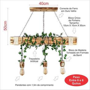 - Fabricada em Madeira Maciça Legalizada e Sustentável; - Acabamento estilo Safari e detalhes em Corda de Sisal; - Altura ajustável, conforme arranjo dos Pendentes; - Acompanha 3 Pendentes com 1,5 Metro cada, a serem dispostos conforme sua preferência; - Acompanha 4 metros de Trepadeira Hera Artificial para decoração do Pendente; - Comprimento de 95cm e largura de 10cm; - ATENÇÃO O peso do produto pode variar entre 6Kg e 8Kg; - Soquetes Padrões E27, com acabamento em Formato de Barril; - Tensão Bivolt 110/220V ; - Acompanha Kit de Fixação.