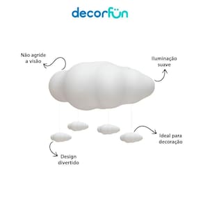 Informações adicionais: Utiliza lâmpada LED até 10W ou fluorescente compacta (lâmpada NÃO inclusa). Para troca de lâmpada você precisará de uma chave philips pequena.Transforme o quarto das crianças em um céu encantado com a Luminária Pendente Tempestade de Nuvens! Seu design traz um toque mágico para o ambiente, criando uma atmosfera aconchegante e cheia de imaginação.
