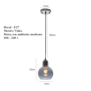 Diâmetro: 12cm Altura do vidro: 20cm Altura: 200 cm ajustável Material: Metal e Vidro Tipo de Lâmpada: E27 Cor: Cabo Preto fosco com detalhes em dourado e vidro Fume Voltagem: Bivolt