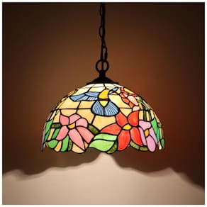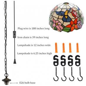 Luminária pendente artesanal em estilo Tiffany com instalação por plugue, composta por base metálica em tom bronze, cúpula em vidro colorido tipo vitral azul com motivo beija-flor, soquete E26 para lâmpadas LED ou incandescentes até 100 W, cabo elétrico de aproximadamente 457 cm, corrente metálica de 102 cm e interruptor em linha tipo botão. A cúpula possui cerca de 30,5 cm de diâmetro e 17,8 cm de altura, adequada para salas de jantar, salas de estar, quartos, corredores, halls e áreas de leitura em ambientes internos.