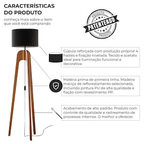 Características Tipo: Luminária de Chão Modelo: Paris Cor da Cúpula: Preto Pés de Madeira Maciça DIMENSÕES DO PRODUTO Altura: 160cm Largura: 40cm Comprimento: 40cm