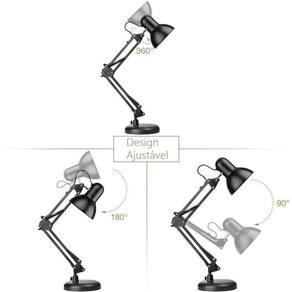 Luminária preto regulavel -para sala Design, modernidade e conforto para a sua leitura. A luminária articulável com base para mesa é ideal para você que estuda ou trabalha e preza por um ambiente mais iluminando. A luminária articulada de mesa vai lhe auxiliar, deixando o ambiente mais claro, favorecendo para a sua concentração e foco, e deixando também o ambiente com um visual mais moderno. A luminária abajur de mesa é feita de um material de ótima qualidade e possui em sua estrutura articulações para que assim você possa dirigir o foco de luz para onde desejar. Ela é compatível com lâmpadas e27, possui um sistema bivolt e compacta. A luminária articulável de mesa possui articulações que ajudam a movimentá-la e direcionar o a luz para onde preferir. Atenção: voltagem do produto - bivolt Atenção: acompanha garra de fixação Atenção: não acompanha lampada Especificações: Cor: preto Material: metal Possui de liga/desliga localizado na parte do fio que liga na tomada Compatível com lâmpadas: e27 de até 40 watts. 2 modos de fixação Haste articulável e flexível Bocal de cerâmica Informações técnicas: Potência máxima das lâmpadas que podem ser usadas: atenção - o produto não acompanha lampas Led: 18w Incandescente: 60w Eletrônica: 30w Tensão: 60hz Frequência: 0,5 Temp. De operação: -5c á 40 c Índice de proteção: ip40 Dimensões aproximadas da luminária completa incluindo base : Altura: 60 cm Largura: 14 cm Dimensões aproximadas da haste articulada : Altura: 47 cm Largura: 4 cm Dimensões aproximadas do bulbo - cúpula Altura: 10 cm Largura: 12 cm Comprimento: 13 cm Circunferência: 39 cm Dimensões aproximadas da base Altura: 3 cm Largura: 15 cm Circunferência: 49 cm Dimensões aproximadas da garra Diâmetro máximo da boca da garra: 4 cm 3 messes de contra defeito de fabricação 1,300kg mod: pix preto Marca: Não Informado Ean: 7907029218610
