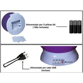 Fonte de energia : Cabo USB ou 4 Pilhas AAA - palito- pilhas não inclusas
