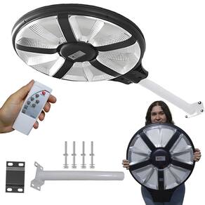 A luminária acompanha um controle remoto para ajustes de modos e tempo de operação e inclui também um suporte para fixação em poste, garantindo instalação prática, segura e firme.
