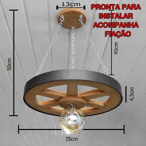 Bem vindo a eco.mercadoshopsCrie inove e encante!A nossa linha de Moveis não para de crescer e agora traz para você, esta linda peça para organizar diversos ambientes da casa.Esta peça com certeza vai deixar a sua casa mais bonita!Luminária roda de carroça RÚSTICO, fabricado em MDF e pintado a Mão. Envernizado deixando um acabamento envelhecido perfeito.Bom para iluminar e decorar ambientes como áreas de garagem, churrasco, garagens com bar, casa, chácara decorar festas, lanchonetes, casa de campo, pousadas:::Especificações Técnica:::::: ACOMPANHA FIAÇÃO :::: CARACTERÍSTICAS:- Marca: Eco- Dimensões: - Diâmetro 35 CM- Peso do Produto 2 kg- Bocais 1- Material: MDF (MEDIUM DENSITY FIBERBOARD)- MDF Ecologicamente Correto com Certificado FSC de alta qualidade- Cor: Mogno, - Borda em MDF 3MM- Nível de Instalação: Fácil:::CONTEÚDO DA EMBALAGEM:::- Ganchos - Soquetes - Base para Teto - Corrente - Fios - Lâmpadas NÃO :::ATENÇÃO::* Os objetos decorativos não acompanham o produto*PERGUNTAS FREQUENTESOS PRODUTOS SÃO NOVOS?Sim! Todos os nossos produtos são novos.OS PRODUTOS TÊM GARANTIA?Sim, todos os nossos produtos têm garantia de fábrica. (12 meses)QUAL A VOLTAGEM?A voltagem depende da lâmpada 100/220 vACOMPANHA AS LÂMPADAS ?As lâmpadas não acompanha o produto Aguardamos sua um compra, é sempre prazer atendê-los