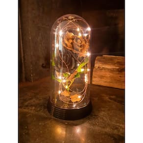 especificação técnica: - marca: amor lindo boutique - altura: 19 cm - diâmetro: 10 cm - material da redoma: acrílico - material das rosas: veludo, plástico e metais - cor das rosas: 1 preta e 1 dourada - material do fio de led: metais e plástico - material da rosa: seda ou veludo e plástico - cúpula de acrílico translúcido - base de plástico - micro luzes de leds / luzes de fadas que, funcionam com apenas 2 baterias cr 2032 já inclusas ;