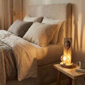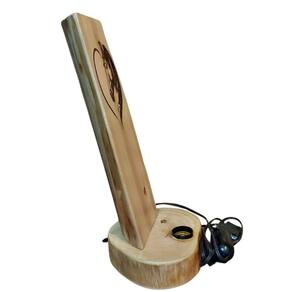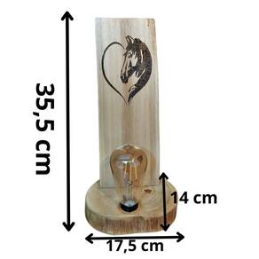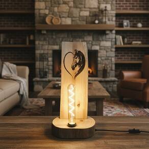 Luminária Rústica de Mesa em Madeira Maciça com pirografia artística detalhada de cara de cavalo em formato de coração.