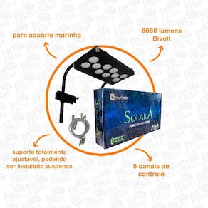 Luminária Solara plus Ocean tech bivolt Tamanho aprox: 25x45x3cm Para aquários até 100cm A luminária solara plus é de para aquários marinhos com corais de máxima exigência ou coluna de água alta. Com cobertura de área máxima de 100cm é ideal para todas espécies de corais e até mesmo os mais exigentes. 4 canais de cores ajustáveis via app/bluetooth Potência 180w / 8080 lúmens / bivolt Peso: 6kg Área de cobertura aprox: 100 cm Com 60 power led's de 3w sendo: 12 x deep blue 450nm 12 x cool white 10000k 12 x light blue 470nm 8 x violet 420nm 4 x uv 395nm 4 x green 520nm 4 x cyan 500nm 4 x red 660nm Marca: Não Informado Ean: 7893199399474