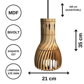 Luminária Teto Tipo Pendente Parafuso Mdf - Completa Mdf Cru Ficha técnica: Altura: 35 cm Largura: 21 cm Diâmetro: 21 cm Espessura: 3 cm Materiais: Madeira MDF Alimentação: Bivolt 110v / 220v Potência: 100 W Ambientes: Exterior e Interior Quantidade de lâmpadas: 1 Tipos de fontes de luz: Soquete E27 Cabo ível e ajustável Material da canopla (peça de acabamento para o teto): Termoplástico Industrial Não é recomendável para lugares sem proteção contra chuva : Desmontado para não ter no , bem fácil de montar
