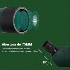 Cor: Verde com Preto. Material do Tripé: Alumínio. Zoom: Ajustável de 25x a 75x. Lente Objetiva: Diâmetro de 6 cm. Lente Ocular: Diâmetro de 3,5 cm.