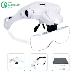 Lupa de Cabeça tipo Óculos com 2 LEDS recarregáveis super brilhantes ideal para leitura, desenho, artesanato, costura, idosos, hobbistas e profissionais. Seu suporte de cabeça é intercambiável e você pode escolher entre hastes ou faixa ajustável. Vem com 5 lentes de diferentes ampliações, fáceis de trocar. Essa Lupa de Cabeça permite o ajuste de direção tanto da luz quanto das lentes e o ajuste de distância entre a lente e os olhos, fazendo com que ela se adapte perfeitamente às necessidades do usuário.