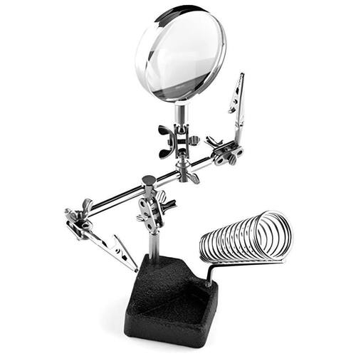 Lupa com garras com suporte para ferro de solda. Serve para fixar a peça a ser soldada ou retrabalhada, para melhor visualização dos componentes a serem soldados, e suporte para apoiar o ferro de solda no momento de descanso e análise do equipamento soldado.