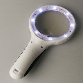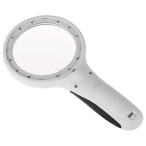 Ótimo para leitura sênior, baixa visão, inspeção, artesanato, passatempo, reparo de eletrônicos e joias. Material: Plástico + borracha + lente óptica acrílica Cor: Branca Quantidade de LED: 9 ( 8 Brancos e Roxo UV) Ampliação: Lente Principal 2,5X e Lente Auxiliar 8X. Tamanho da Lente Principal: Diâmetro 90mm Tamanho da Lente Auxiliar: diâmetro 22mm Alimentação: 3 pilhas AAA (não incluídas) Tamanho: 22,5x11x2 AxLxP Peso líquido: 120g