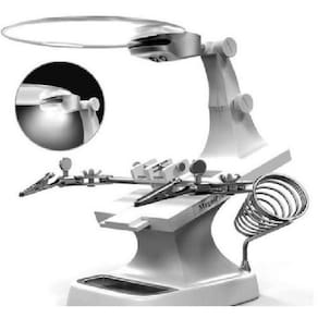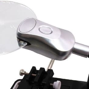 Esta lupa de bancada possui lente de 90 mm de diâmetro, garras para fixação e iluminação integrada por 2 LEDS facilitando a observação de detalhes em seu trabalho.