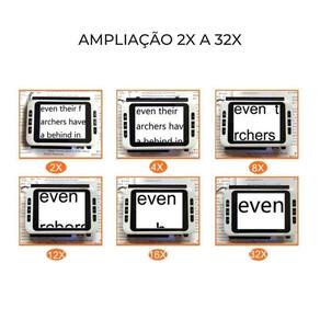 Detalhes técnicos: Tela de lcd 3,5 tft colorida de resolução 320x240p. Ampliação continuamente ajustável de 2x-32x. 3 modos de cores para melhor leitura colorido, preto e fundo branco, branco fundo preto . Saída a/v para tv. Bateria de lítio 1650mah recarregável, com uso contínuo de 3 horas. Contraste com 4 níveis de ajuste. Brilho ajustável do backlight e intensidade ajustável da luz de preenchimento. Congelamento de tela: congela uma imagem de texto na tela para facilitar a leitura. Tira foto necessário cartão de memoria não incluso . Alça removível para uso confortável e fácil.