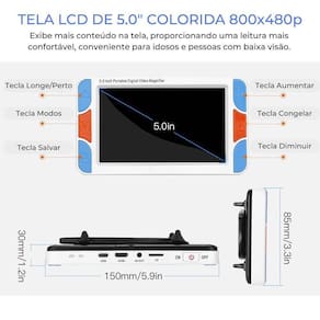 Não deixe a baixa visão prejudicar sua qualidade de vida. Com a vídeo lupa digital portátil tela 5,0 colorida, você pode ter uma experiência de leitura e escrita muito mais confortável. Com sua tela lcd colorida de alta definição de 5.0, câmera dupla e ampliação continuamente ajustável de 3x a 48x, esta lupa é perfeita para aqueles que precisam de ajuda para enxergar melhor. Além disso, ela possui 26 modos de cores para uma leitura ainda mais confortável e agradável.Com a bateria de lítio 2500mah recarregável, você pode usar a lupa continuamente por até 4 horas. E se você precisar de mais luz, o brilho do backlight e a intensidade da luz de preenchimento são ajustáveis. Congele a tela para facilitar a leitura ou use a cortina eletrônica para destacar o texto e evitar a interferência de luz.A vídeo lupa digital portátil também possui uma função de prompt de voz, lanterna e suporte para escrita. E se você quiser compartilhar imagens com outras pessoas, a saída de tv suporta saída hdmi 1080i 60 fps ou saída audio/video. Quando não estiver em uso, ela desliga automaticamente após 3 minutos.Com sua alça removível, a lupa é fácil de usar e confortável para transportar. Não deixe que a baixa visão atrapalhe a sua vida. Adquira agora a vídeo lupa digital portátil tela 5,0 colorida e tenha uma vida mais confortável e feliz.Detalhes técnicos:Tela de lcd 5.0 colorida de alta definição 800x480p.Câmera dupla, visualização tanto de longe quanto de perto.Ampliação continuamente ajustável de 3x-48x.26 modos de cores para melhor leitura.Bateria de lítio 2500mah recarregável, com uso contínuo de 4 horas.Brilho ajustável do backlight e intensidade ajustável da luz de preenchimento.Congelamento de tela: congela uma imagem de texto na tela para facilitar a leitura.Função de cortina eletrônica: destaca o texto horizontalmente e verticalmente para evitar interferência de luz.As imagens podem ser capturadas, salvas, lembradas e transferidas para um pc necessário cartão de memoria não incluso .Função de prompt de voz suportada 30 segundos .Função de lanterna.Saída de tv: suporta saída hdmi 1080i 60 fps ou saída audio/video.Suporte para escrita para ajudar a escrever.Desliga automaticamente sem uso por 3 minutos.Alça removível para uso confortável e fácil.Detalhes do produto:Dimensão: 150 l x 84 c x 30 a mm, 5,9 x 3,3 x 1,2 .Peso: 230g 8,5oz incluindo a bateria.Inclui:1 vídeo lupa digital portátil tela 5,0 colorida.1 bateria, 1 cabo de saída de vídeo.1 cabo hdmi.1 cabo de carregamento usb.1 adaptador de energia ac 110v-240v .1 manual do usuário.1 pano de limpeza.1 cordão.1 bolsa de transporte.1 bracket.