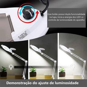 A lupa possui um suporte garra para fixar na mesa. Flexivel para mover em varios angulos, permitindo uma inspeçao detalhada.