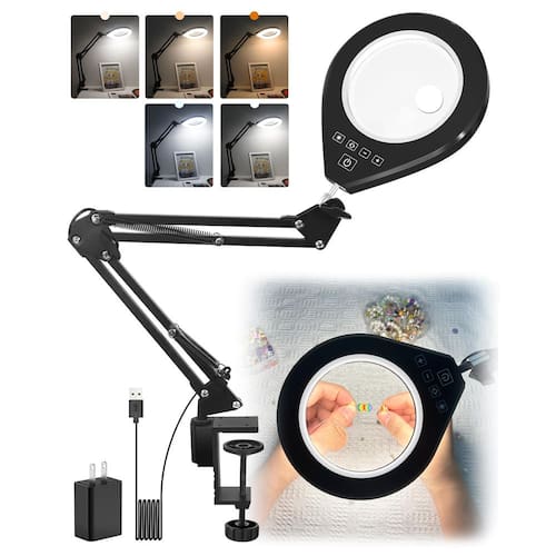 ? Lupa de iluminação para trabalho de precisão? Esta lupa ?10X com luz? revoluciona tarefas orientadas para detalhes com seu sistema de ampliação dupla ? (10X e 5X) e design de grampo ajustável ?. A lâmpada de artesanato de LED regulável ? oferece 10 níveis de brilho e 5 temperaturas de cor (2700K-6500K), criando condições ideais de iluminação para o reparo do relógio ?, ? solda de placa de circuito ? e ?pintura em miniatura?. Excelência técnica: classificação IPX4 à prova d'água? resiste a ambientes de oficina braço rotativo de 360° com força de grampo ? estabiliza em bancadas de trabalho de até 7,6 cm de espessura ? compatível com lâmpada E27 ? design permite uso híbrido com luminárias existentes. A matriz de LED de 24 W de economia de energia ? oferece iluminação de 2000LM de nível museu. Aplicações de cenário ? ? Fabricação de joias ? e ?iluminação de bordado? ? ? Auxiliares de baixa visão para idosos ? para leitura de letras pequenas ? ? Estação de trabalho de reparo PCB Ferramenta essencial ? ? Construção de modelo arquitetônico ? iluminação de precisão Design centrado no usuário A lâmpada de lupa ergonômica ? apresenta filme de difusão antirreflexo e tecnologia de filtro de luz azul ? (certificada pela EyeSafe), reduzindo o cansaço ocular durante prolongamento ed ?sessões de artesanato?. A função de memória lembra automaticamente sua última predefinição de brilho/cor ? para operação instantânea. Premium Assurance Componentes certificados UL/CE/FCC com garantia de 3 anos. Inclui kit de limpeza de lupa ? e adaptadores de grampo universal ? para configurações de estação de trabalho DIY.