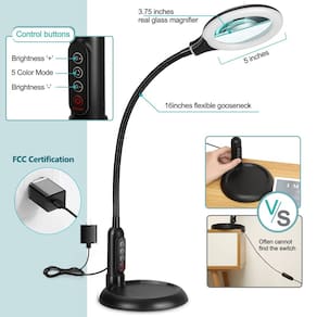 - Lupa de vidro real -- A fim de levar em consideração a estabilidade e a praticidade da lupa de mesa (ampliação e distância focal apropriadas), após repetidos testes e pesquisas, a lupa de vidro real de 5X (8 dioptrias) -3,75 polegadas (lente de 5,2 polegadas) foi finalmente determinada, especialmente adequada para artesanato, leitura, pintura em miniatura, leitura, costura, hobbies, mini tarefas, joias, soluções enfeitar, enfeitar, amarrar moscas, etc.