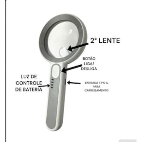 INFORMAÇÕES TÉCNICAS: Marca: Jiaxi / Modelo: 6516C Material: Plástico ABS + lente óptica acrílico Bateria Recarregável: 650mAh Li-ion Tipo de Carregamento: Cabo USB Acompanha Cabo USB: Sim Fonte LED Iluminação: 16 LEDs Brilho Ajustável Diâmetro Da Lente primária: 65mm Diâmetro Da Lente auxiliar: 15mm Ampliação Da Lente Primária: 6x Foco 83mm Lente auxiliar Ampliação: 12x Foco 41mm Tamanho do Produto: 18,5cm x 8,5cm Cor do Produto: Branco com Cinza Peso: 90g