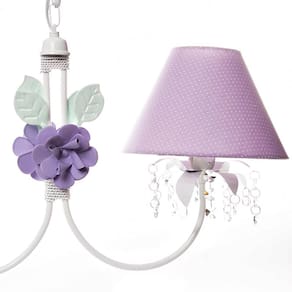Este lustre vai proporcionar uma iluminação perfeita, tornando o ambiente agradável e aconchegante. Opte por este lustre encantador para realçar a decoração do quarto do bebê. Dados Técnicos Lustre de 2 lâmpadas em alumínio com pintura eletrostática branca, cúpulas em acetato forrado com tecido, 2 florzinhas de metal lilás e decoração com cristais. Lâmpadas Suportadas Econômicas/ Led: Qualquer Lâmpada Incandescente amarela : Até 40w por Soquete Medidas Largura: 42 cm Altura: 35 cm Corrente: 25 cm Marca: Não Informado