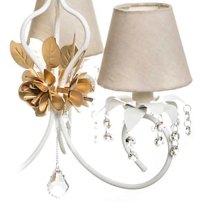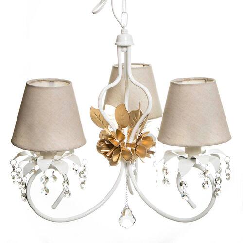 Quebre a monotonia com este lustre torneado com cúpula em tecido e detalhes encantadores, que será um elemento decorativo determinante para o espaço em que estiver exposto. Proporciona uma iluminação uniforme e agradável para o quarto do bebê. Dados TécnicosLustre de 3 lâmpadas em alumínio com pintura eletrostática branca, cúpulas em acetato forrado com tecido, 3 flores com folhas de metal dourado no centro e decoração com cristais.Contém 1 cristal em forma de gota pendurado no lustre Lâmpadas SuportadasEconômicas/ Led: Qualquer LâmpadaIncandescente amarela : Até 40w por Soquete MedidasLargura: 38 x 38 cmAltura: 40 cmCorrente: 25 cm