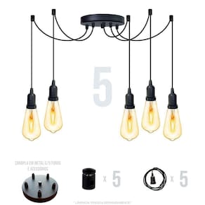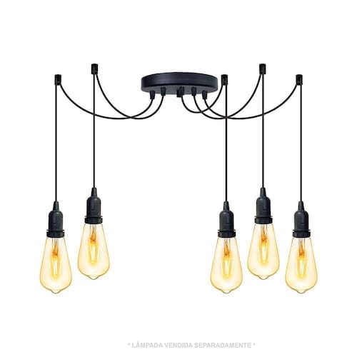 Lustre Aranha Com 5 Pendentes (2m Cabo Preto + Soquetes + Canopla) Lustre Aranha com multiplos pendentes saindo da mesma canopla, muito elegante e com design minimalista, perfeito par uma decoração moderna. Cada pendente possui 2 metros de cabo e soquete. Ideal para ser junto com lâmpada de filamento no estilo retro. Descrição Técnica: - Modelo: Lustre Aranha com cabo + soquete - Número de pendentes: 5 - Comprimento de cada pendente: 2 metros - Material: Cabo PP preto - Canopla: Metal com furação - Acessórios: Trava cabo para canopla. - Soquete: Padrão Nacional E27 - Suporte: Barra chata para o teto