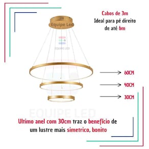 Design Contemporâneo: Com três anéis de diferentes tamanhos 60cm, 40cm e 30cm , este lustre proporciona uma iluminação dinâmica e atraente, ideal para adicionar um toque de classe ao seu espaço.