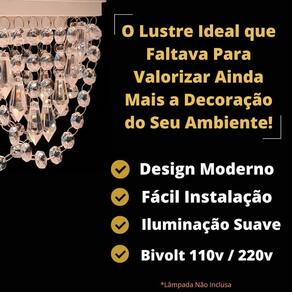 A altura do lustre é de 15 cm e ele é bivolt, podendo ser utilizado tanto em redes elétricas de 127v quanto de 220v. O lustre é enviado montado e pronto para instalação, agilizando assim o processo de decoração.