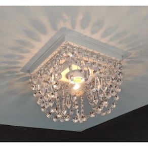 Com um tamanho compacto, o lustre possui uma base plafon quadrada de 19 cm em acrílico na cor branca. As castanhas também são feitas de acrílico transparente, proporcionando um efeito de brilho e elegância quando o lustre está iluminado.