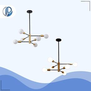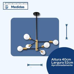 Acabamento: Preto com Dourado 6 Hastel para lâmpada de soquete E27 Soquetes E27 de até 40W por bocal Altura do suporte: 2cm Diâmetro do suporte: 12cm Comprimento total: 104cm Largura total: 42cm Cabo ajustável de 3m fácil ajuste Material: Estrutura em alumínio com acabamento preto e dourado
