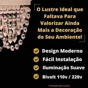 Com uma altura de 15 cm, esse lustre é perfeito para ambientes com pé direito baixo, como banheiros. Ele possui uma voltagem bivolt, podendo ser utilizado em redes elétricas de 127v ou 220v. Além disso, o lustre é enviado montado e pronto para instalação, facilitando ainda mais o processo.