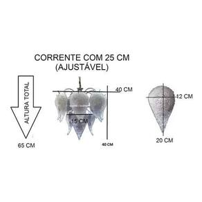 Lustre Folhas Para 3 Lampadas Soquete E27 Potência Máxima 60w Pode-se usar lâmpada Incandescente ou econômica. Base e acabamentos em inox cromado Folha em policarbonato branco com 20 x 12 cm 12 Folhas Diâmetro: 40cm + Comprimento 40 cm + 25 cm de corrente ajustável