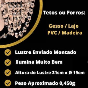 Com uma altura de 15 cm, esta luminária possui voltagem bivolt, podendo ser utilizada tanto em redes elétricas de 127v quanto de 220v. Além disso, este lustre é enviado montado e pronto para instalação, facilitando assim o processo de utilização.