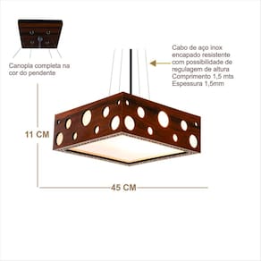 Lustre decorativo madeira pendente mariscal quad 45cm Cor: pau ferro A iluminação certa pode transformar um ambiente, deixando-o mais requintado, confortável e aconchegante. Nossas luminárias são criadas e desenvolvidas com a intenção fazer essa transformação, pois são construídas com material de primeira e com projetos muito bem elaborados, unindo beleza, funcionalidade e bom gosto. Conseguimos com elas, fazer o casamento do acrílico, alumínio e madeira de maneira harmônica.